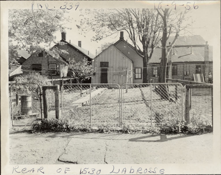 Rear view of one-story front-gabled wooden-frame house located at 1530 Labrosse, parcel 339, in Corktown. Clothesline in backyard; chain link fence in foreground. Handwritten on front: "Par. 339, rear of 1530 Labrosse, 10-9-56."