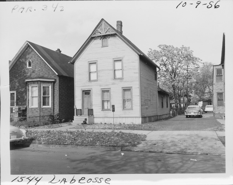 Front and side view of two-story front-gabled wooden-frame house with one-story rear wing located at 1544 Labrosse, parcel 342, in Corktown. Automobile parked in driveway next to house. Handwritten on front: "Par. 342, 1544 Labrosse, 10-9-56."