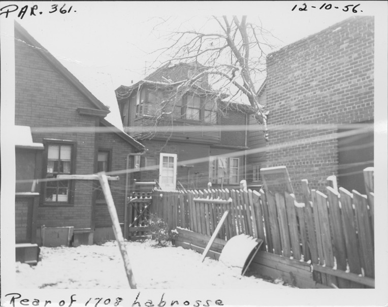 Rear view of two-story brick house with hipped roof located at 1708 Labrosse, parcel 361, in Corktown. Fence and adjacent yard in foreground; partial view of brick garage at rear of property. Handwritten on front: "Par. 361, 1708 Labrosse, 12-10-56."