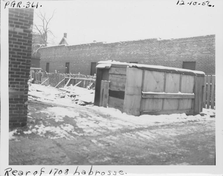 View from alley of wooden shed located at the rear of 1708 Labrosse, parcel 361, in Corktown. Partial view of adjacent brick garage behind wooden fence. Handwritten on front: "Par. 361, rear of 1708 Labrosse, 12-10-56."