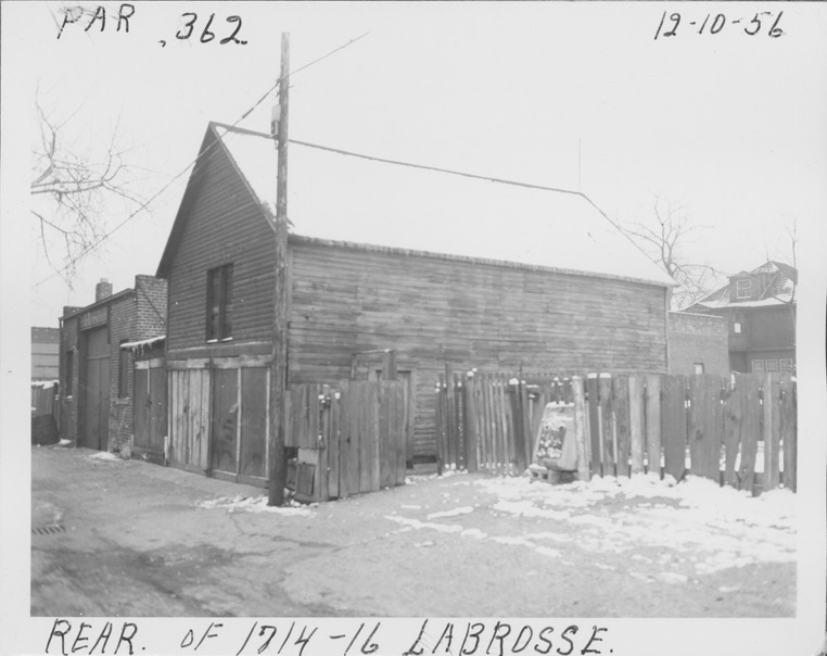 View from alley of front-gabled wooden-frame garage located at the rear of 1714-1716 Labrosse, parcel 362, in Corktown. Wooden fence adjacent to garage. Handwritten on front: "Par. 362, rear of 1714-16 Labrosse, 12-10-56."