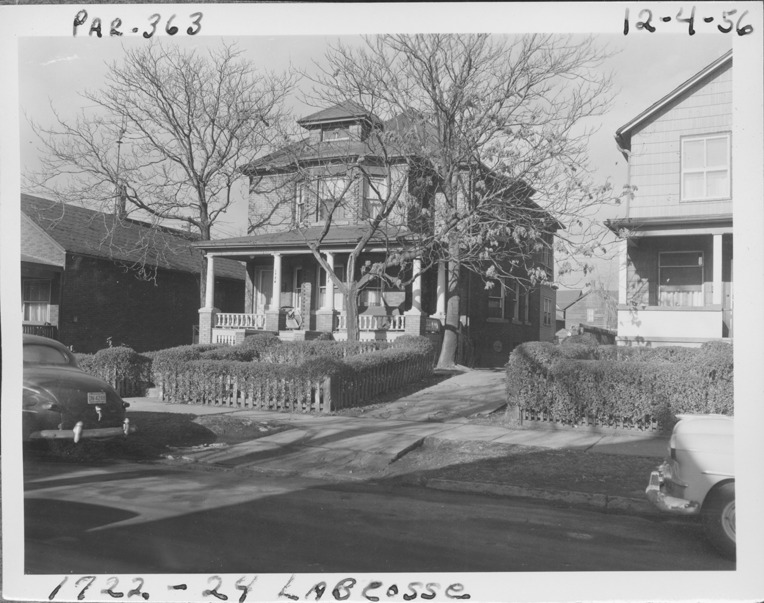 Front and side view of two-story brick house with hipped roof located at 1722-1724 Labrosse, possibly a duplex, parcel 363, in Corktown. House has gabled dormer and covered entry porch. Hedges border front yard. Handwritten on front: "Par. 363, 1722-24 Labrosse, 12-4-56."
