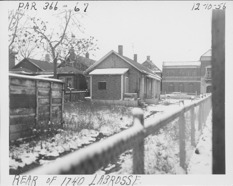 Rear and side view of one-story front-gabled house with simulated brick siding located at 1740 Labrosse, parcels 366 and 367, in Corktown. Chain link fence with wooden posts surrounds side yard; wooden shed in back of house. Handwritten on front: "Par. 366-67, rear of 1740 Labrosse, 12-10-56."