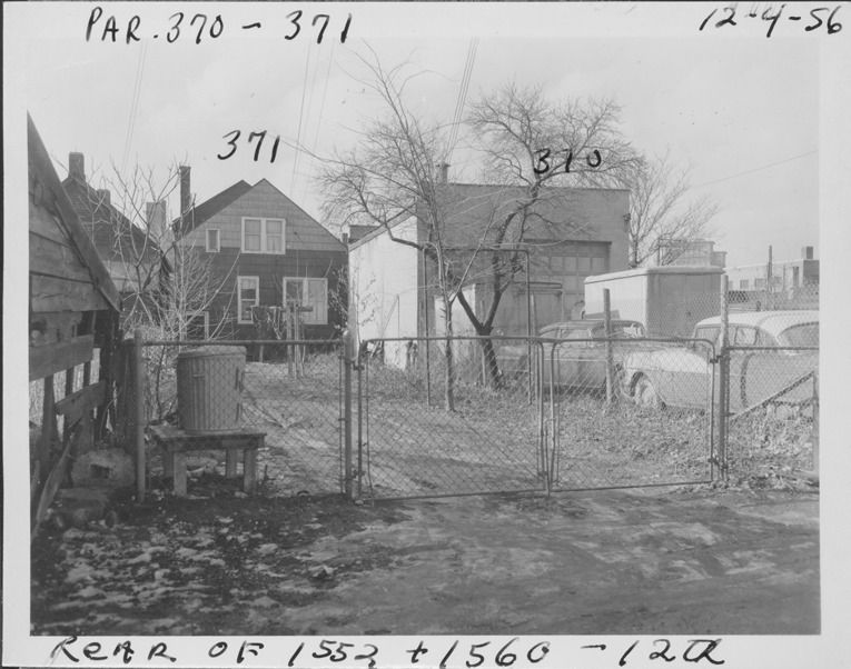 Rear view of one-story concrete block building with flat roof located at 1560 12th St. and two-story front-gabled house with shingle siding located at 1552 12th St., parcels 370 and 371, in Corktown. Automobiles and truck parked in yard behind building; chain link fence borders alley. "370" drawn on photograph over building on right; "371" drawn on photograph over house on left. Handwritten on front: "Par. 370-371, rear of 1552 & 1560 12th St., 12-4-56."
