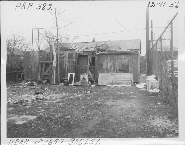 Shed at bottom of yard at 1657 Bagley, parcel 382, in Corktown. Construction debris by shed; chain link fence along side. Handwritten on front: "Par. 382, rear of 1657 Bagley, 12-11-56."