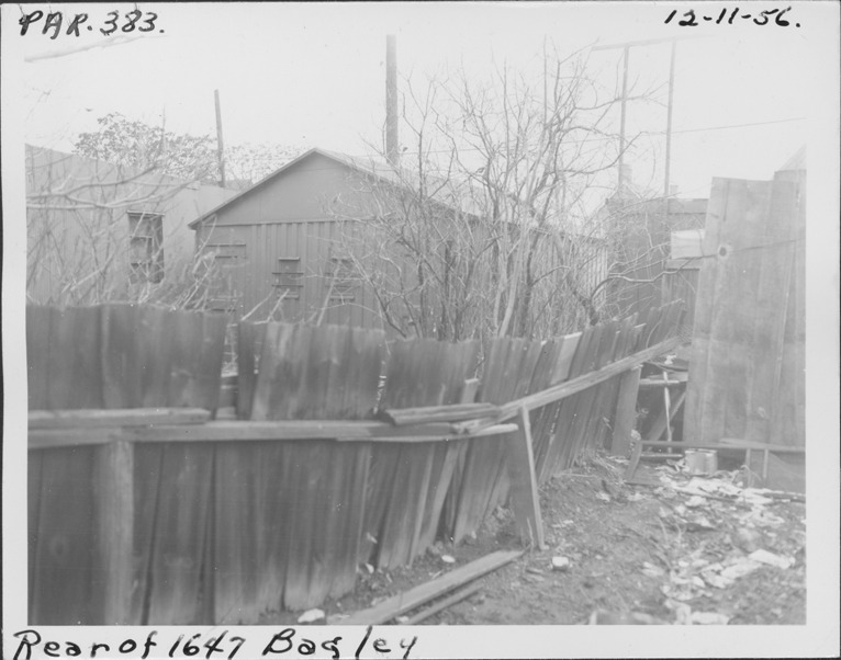Batten-and-board building at rear of 1647 Bagley, parcel 383, in Corktown. Viewed at an angle across board fence from neighboring yard. Handwritten on front: "Par. 383, rear of 1647 Bagley, 12-11-56."