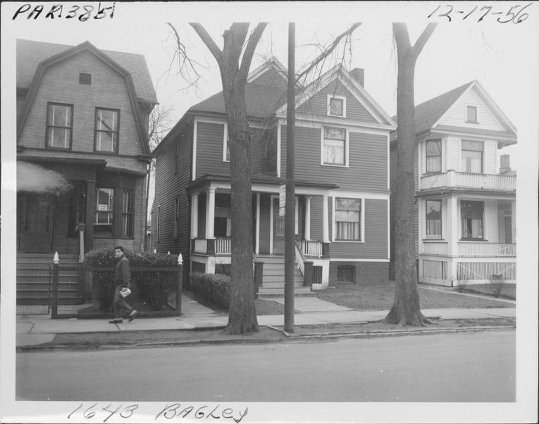 Two and a half-story clapboard house at 1643 Bagley, parcel 385, in Corktown. Houses on each side; one has sign reading "Sleeping rooms." Man passing on sidewalk. Handwritten on front: "Par. 385, 1643 Bagley, 12-17-56."