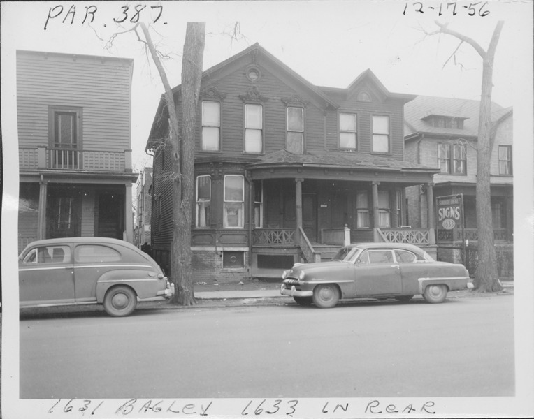 Two-story clapboard house at 1631 Bagley, parcel 387, in Corktown. Uneven roofline; bay window; porch across much of front. Decorative trim above windows and round attic windows. Houses on each side. Handwritten on front: "Par. 387, 1631 Bagley, 1633 in rear, 12-17-56."