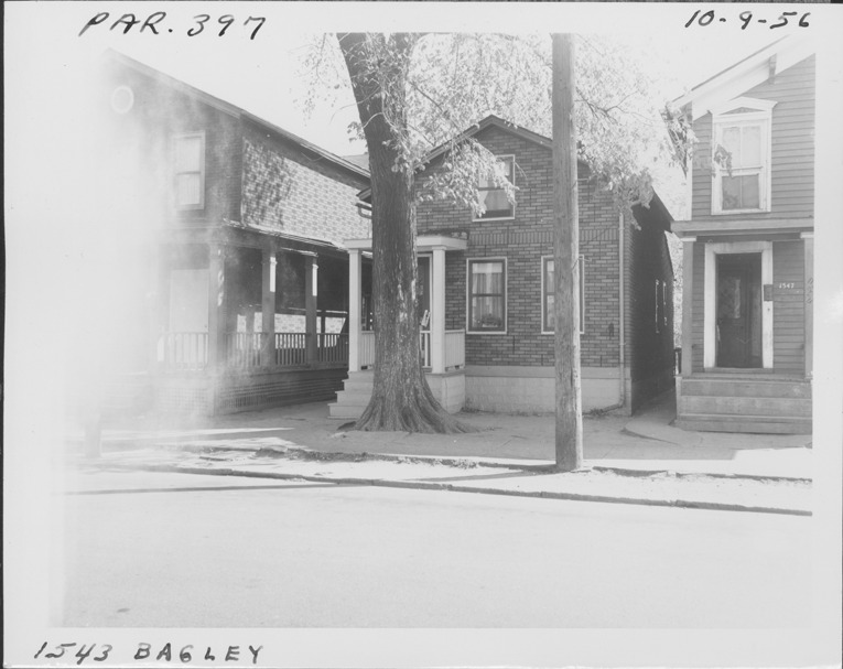 One and a half-story house at 1543 Bagley, parcel 397, in Corktown. Simulated brick siding. Two-story houses on each side. Handwritten on front: "Par. 397, 1543 Bagley, 10-9-56."