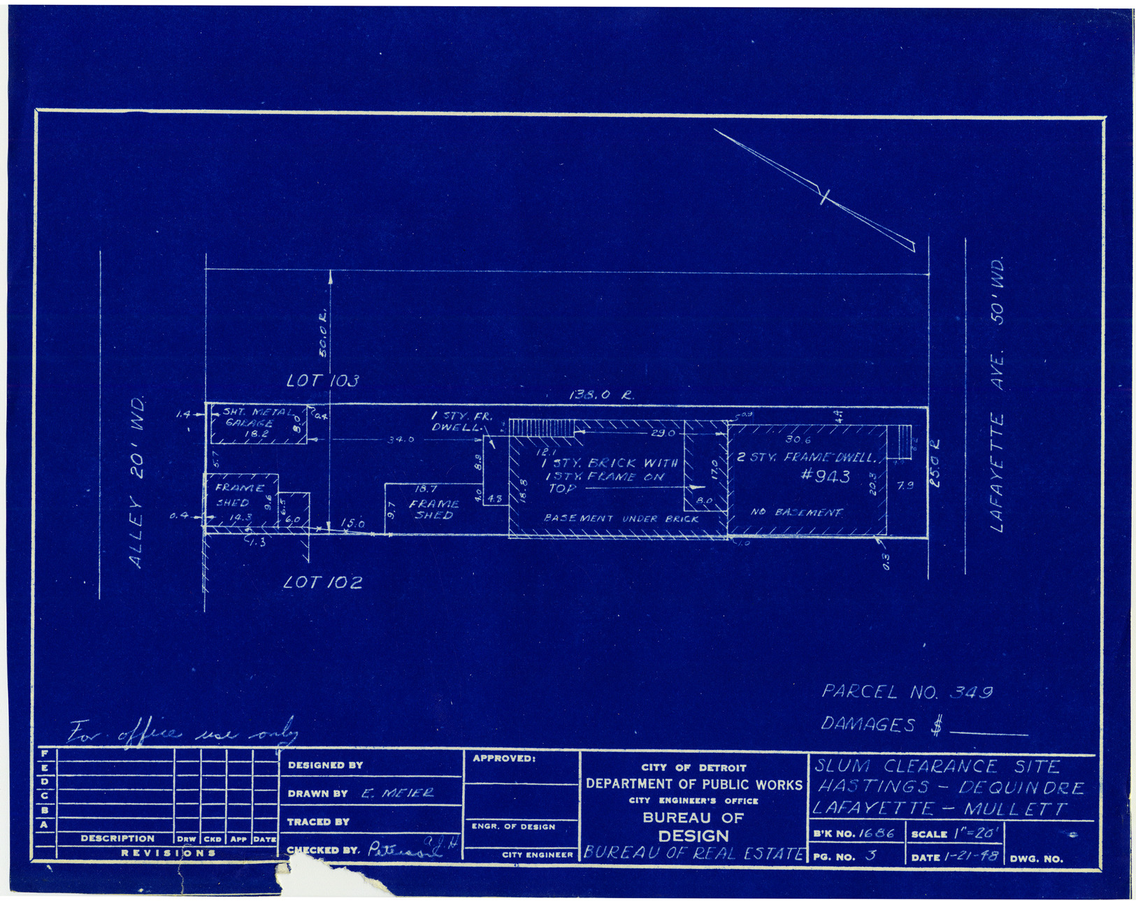 Part of a collection that contains condemnation files, photographs, blueprints and descriptions of slum clearance housing parcels for the City of Detroit. Of particular note are areas which included the neighborhoods known as Paradise Valley, Black Bottom, Corktown and the Jeffries Housing Project.