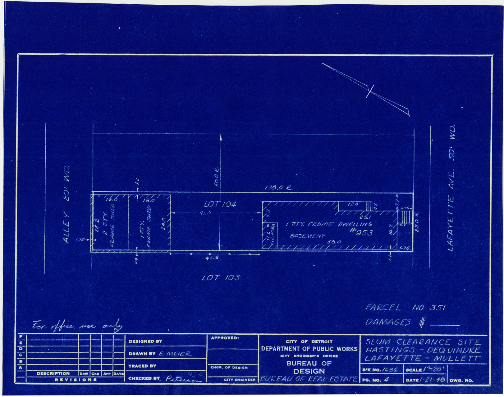 Part of a collection that contains condemnation files, photographs, blueprints and descriptions of slum clearance housing parcels for the City of Detroit. Of particular note are areas which included the neighborhoods known as Paradise Valley, Black Bottom, Corktown and the Jeffries Housing Project.