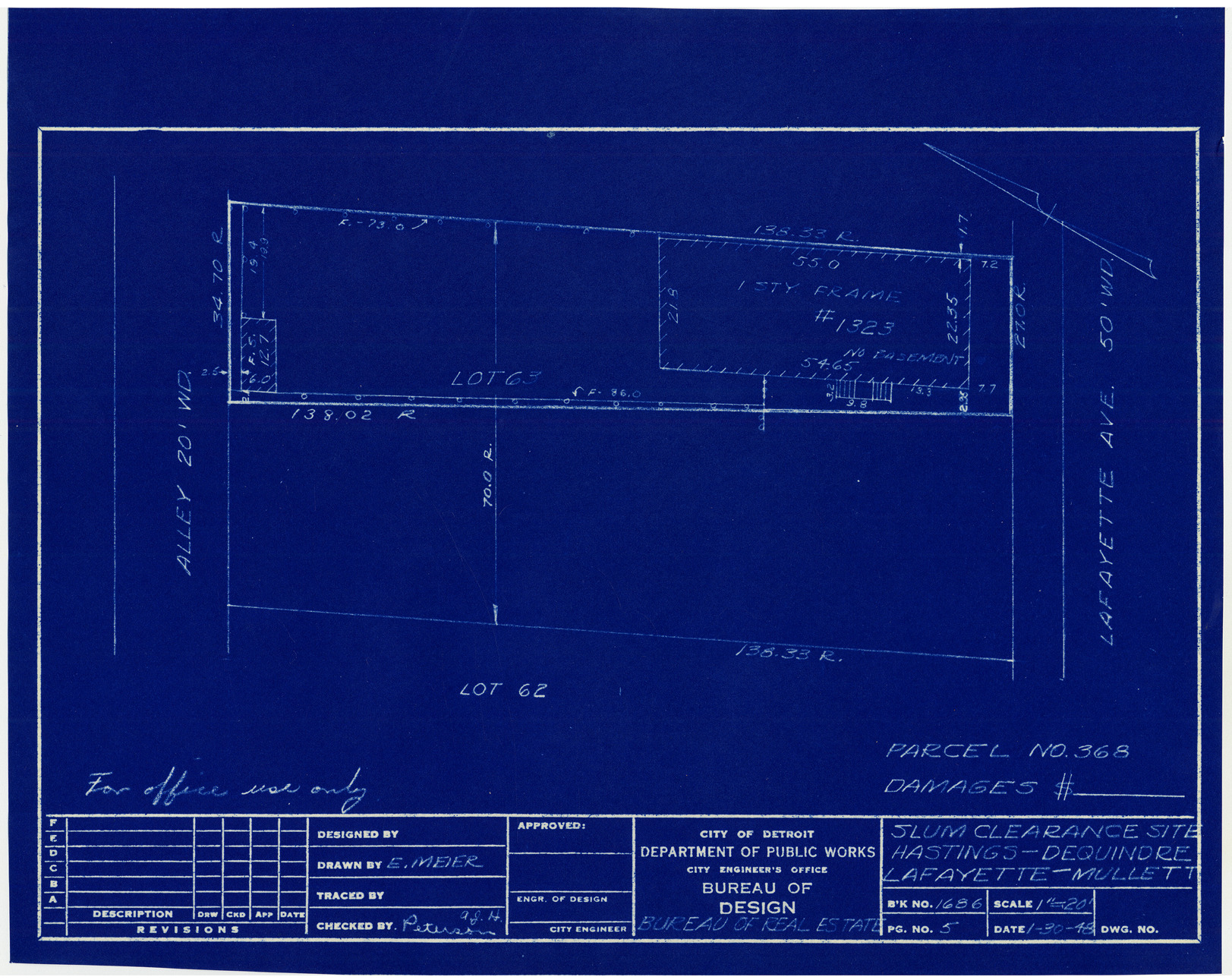 Part of a collection that contains condemnation files, photographs, blueprints and descriptions of slum clearance housing parcels for the City of Detroit. Of particular note are areas which included the neighborhoods known as Paradise Valley, Black Bottom, Corktown and the Jeffries Housing Project.
