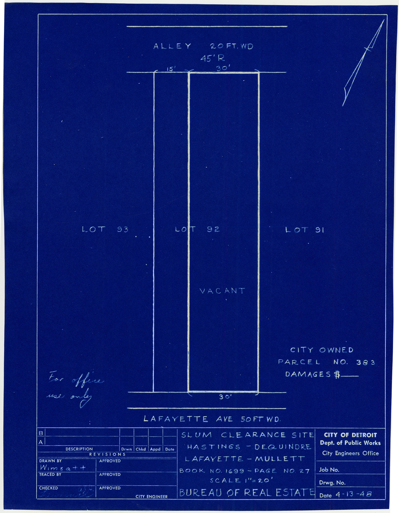 Plot plan for property located on Lafayette, city owned parcel 383. Recorded on blueprint: "Slum clearance site; Hastings, Dequindre, Lafayette, Mullett."