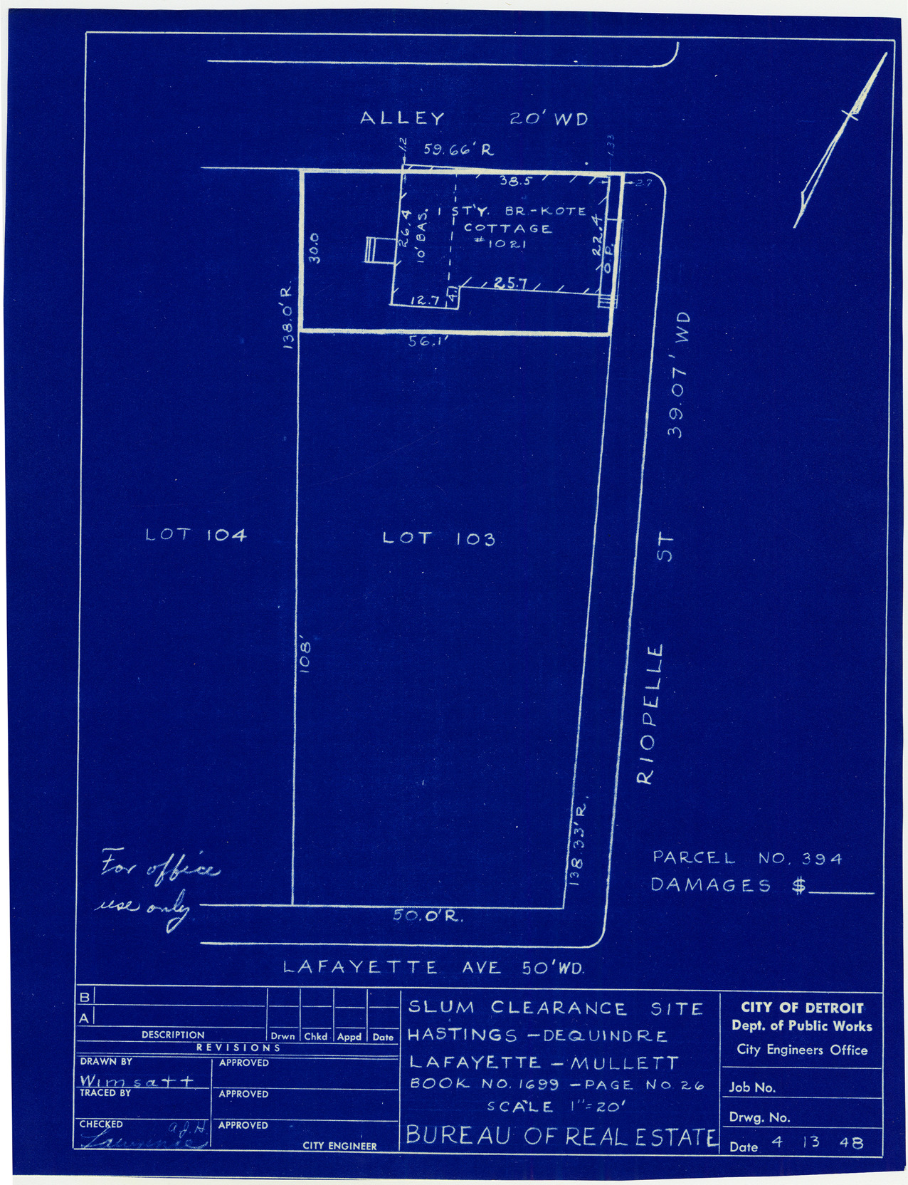 Plot plan for property located on the corner of Lafayette and Riopelle, parcel 394. Recorded on blueprint: "Slum clearance site; Hastings, Dequindre, Lafayette, Mullett."
