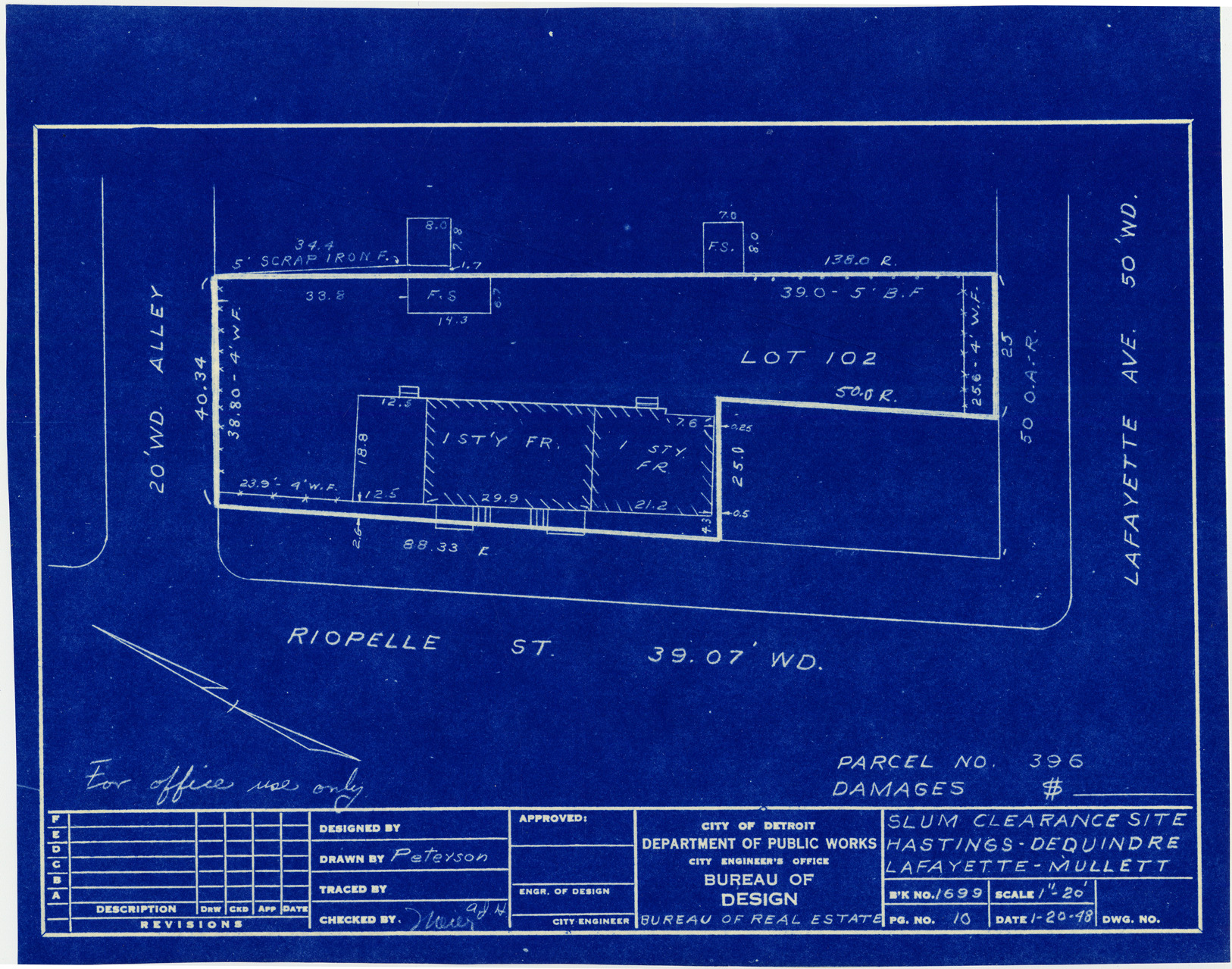 Plot plan for property located on the corner of Lafayette and Riopelle, parcel 396. Recorded on blueprint: "Slum clearance site; Hastings, Dequindre, Lafayette, Mullett."