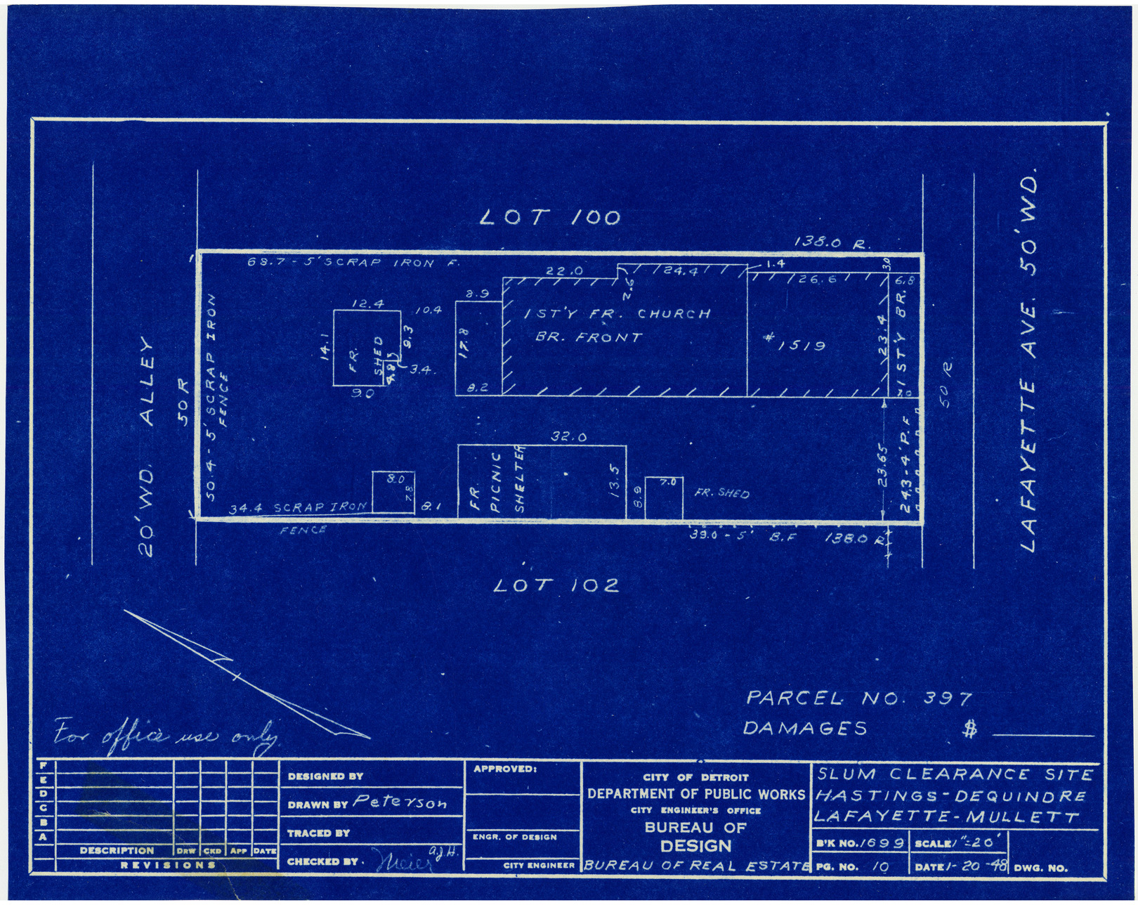 Part of a collection that contains condemnation files, photographs, blueprints and descriptions of slum clearance housing parcels for the City of Detroit. Of particular note are areas which included the neighborhoods known as Paradise Valley, Black Bottom, Corktown and the Jeffries Housing Project.