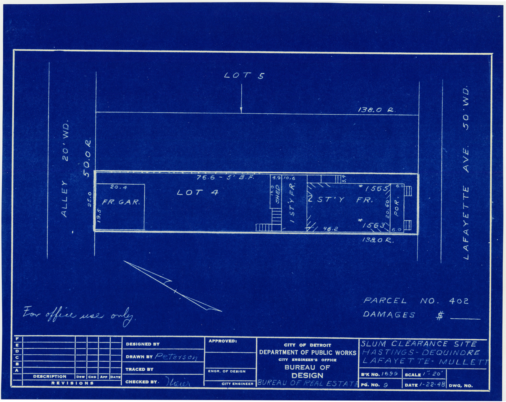 Part of a collection that contains condemnation files, photographs, blueprints and descriptions of slum clearance housing parcels for the City of Detroit. Of particular note are areas which included the neighborhoods known as Paradise Valley, Black Bottom, Corktown and the Jeffries Housing Project.