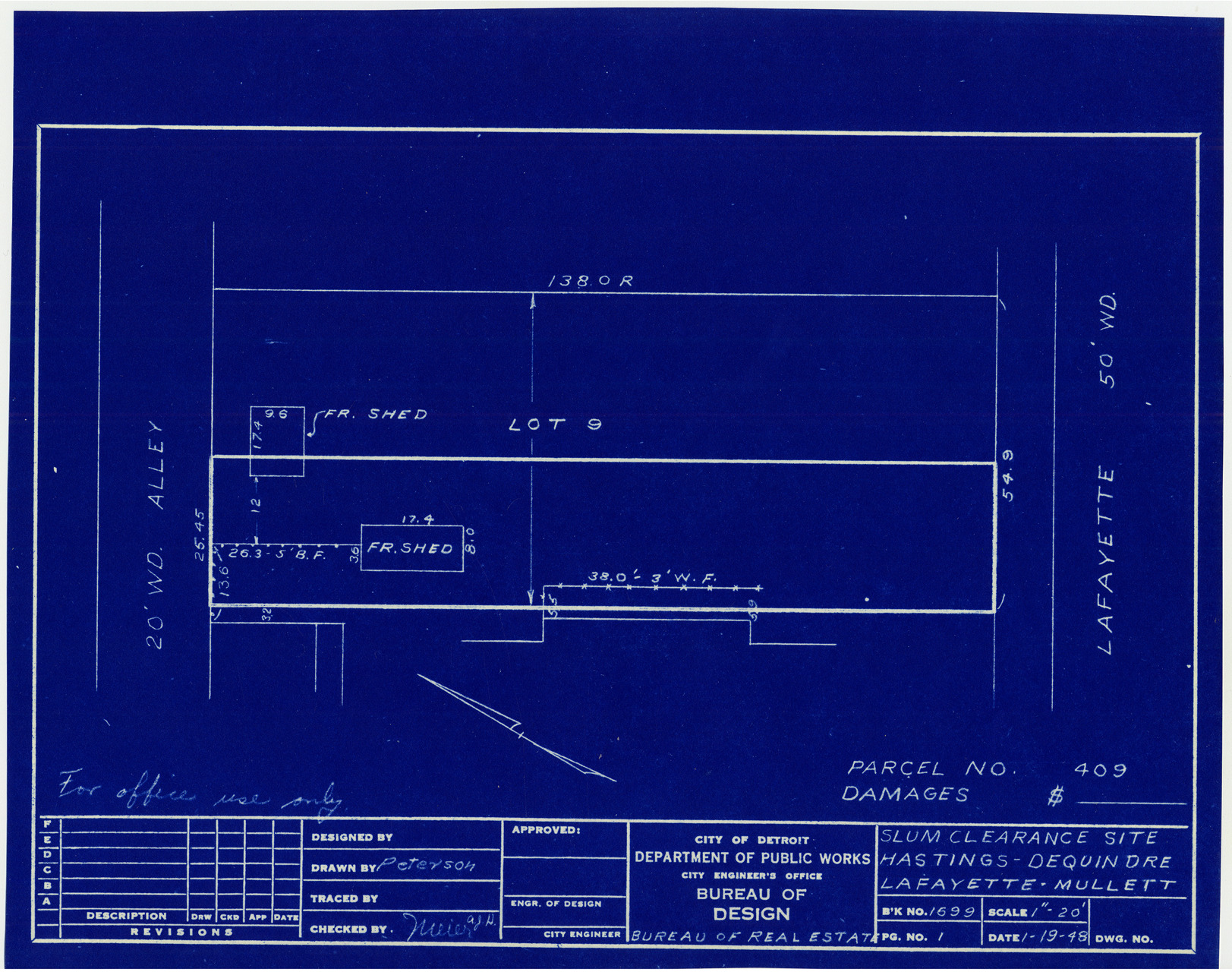 Part of a collection that contains condemnation files, photographs, blueprints and descriptions of slum clearance housing parcels for the City of Detroit. Of particular note are areas which included the neighborhoods known as Paradise Valley, Black Bottom, Corktown and the Jeffries Housing Project.