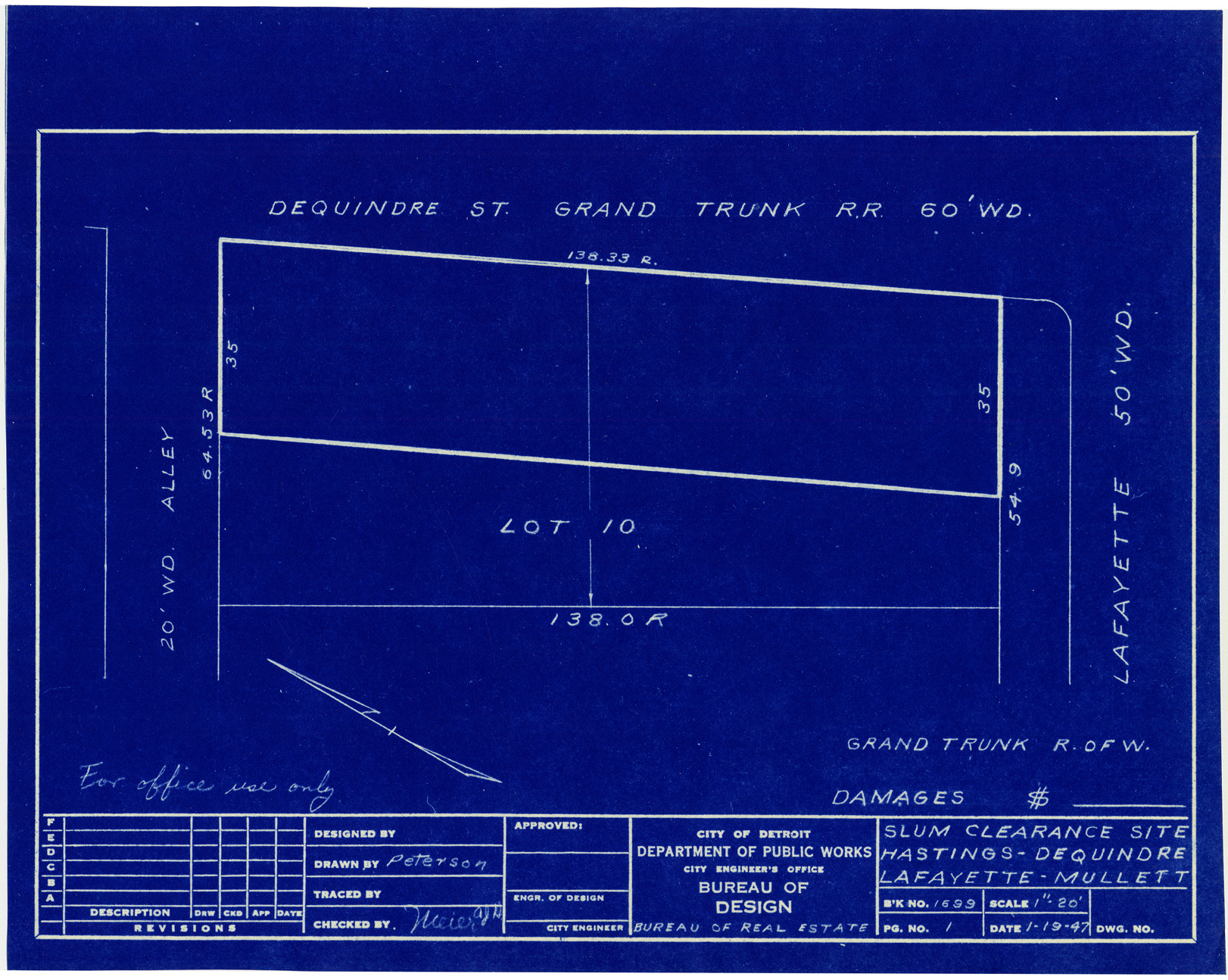 Plot plan for property located on the corner of Lafayette and Dequindre, Grand Trunk R. of W. Recorded on blueprint: "Slum clearance site; Hastings, Dequindre, Lafayette, Mullett."