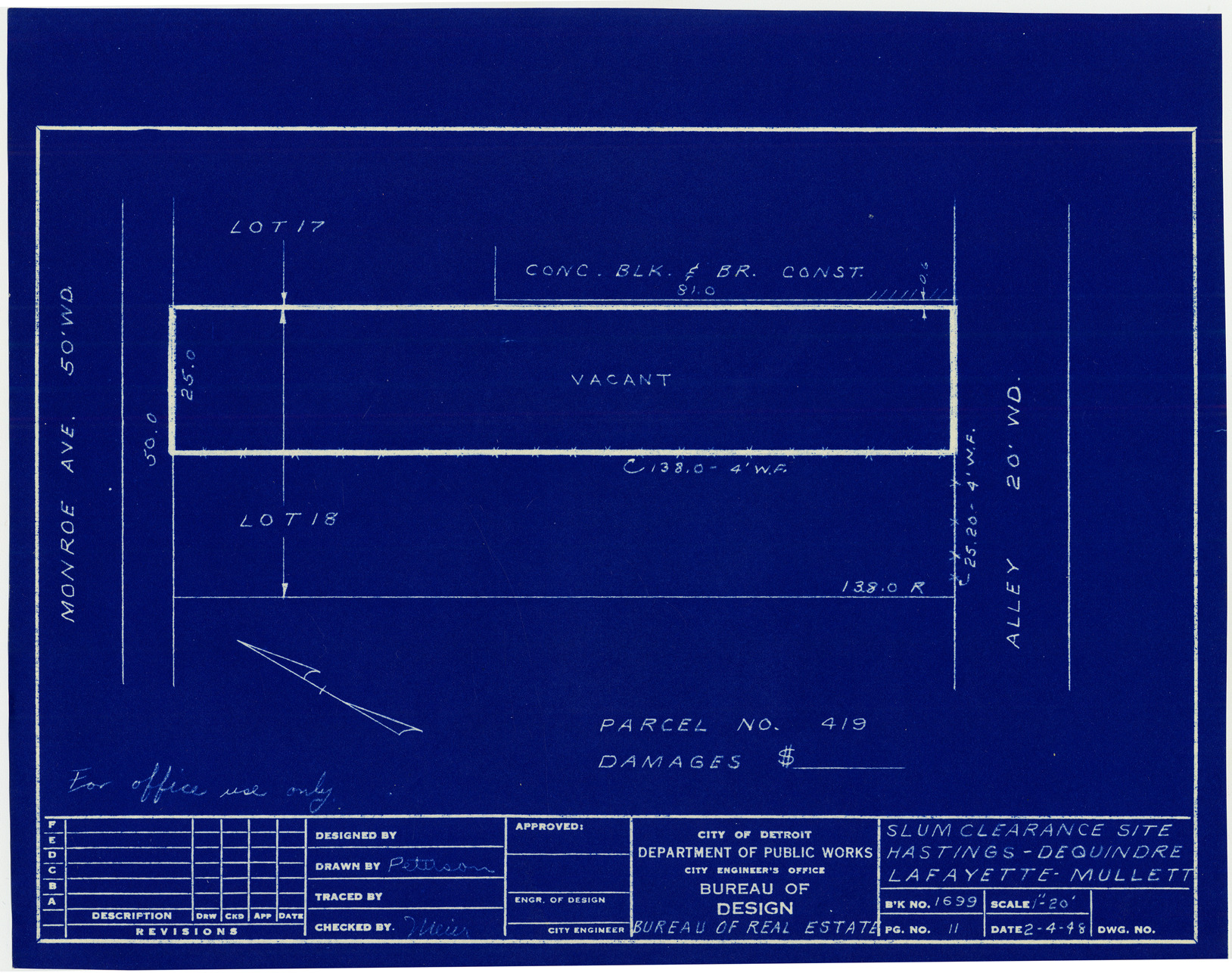 Part of a collection that contains condemnation files, photographs, blueprints and descriptions of slum clearance housing parcels for the City of Detroit. Of particular note are areas which included the neighborhoods known as Paradise Valley, Black Bottom, Corktown and the Jeffries Housing Project.