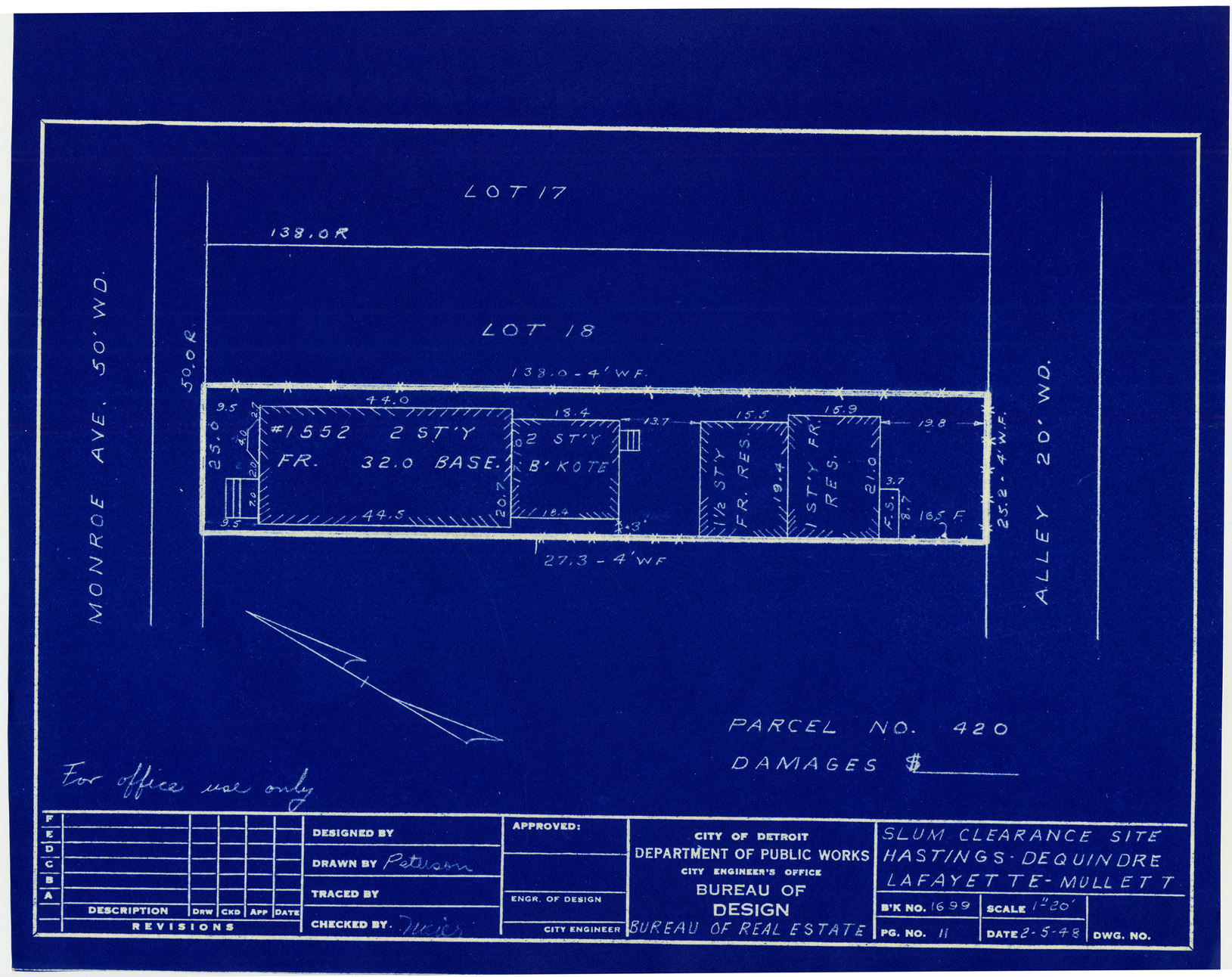 Part of a collection that contains condemnation files, photographs, blueprints and descriptions of slum clearance housing parcels for the City of Detroit. Of particular note are areas which included the neighborhoods known as Paradise Valley, Black Bottom, Corktown and the Jeffries Housing Project.