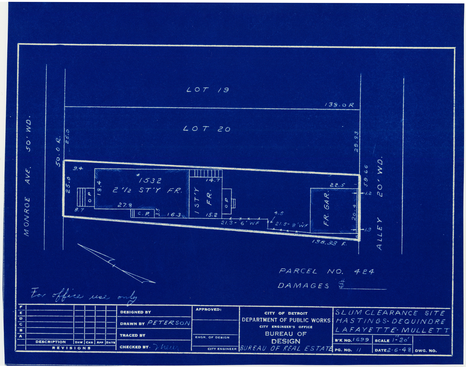Part of a collection that contains condemnation files, photographs, blueprints and descriptions of slum clearance housing parcels for the City of Detroit. Of particular note are areas which included the neighborhoods known as Paradise Valley, Black Bottom, Corktown and the Jeffries Housing Project.