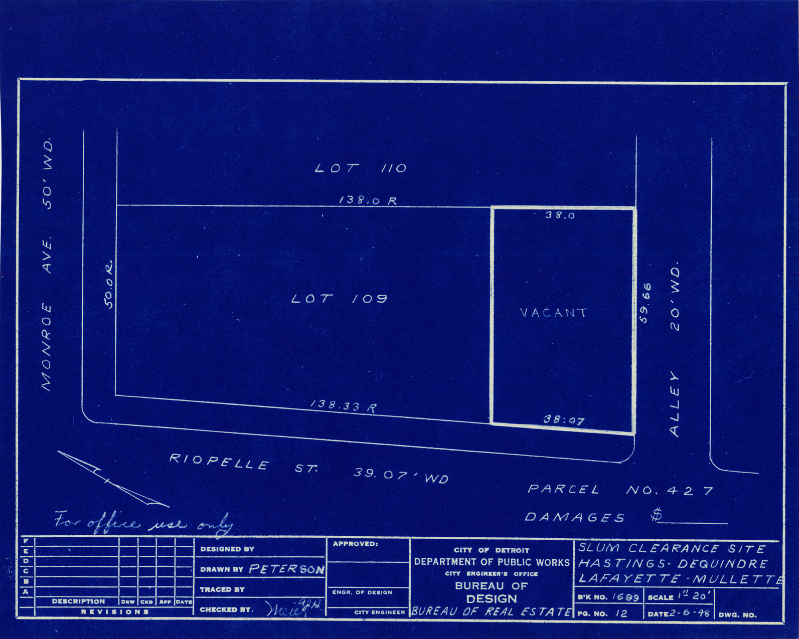 Plot plan for property located on the corner of Monroe and Riopelle, parcel 427. Recorded on blueprint: "Slum clearance site; Hastings, Dequindre, Lafayette, Mullett."