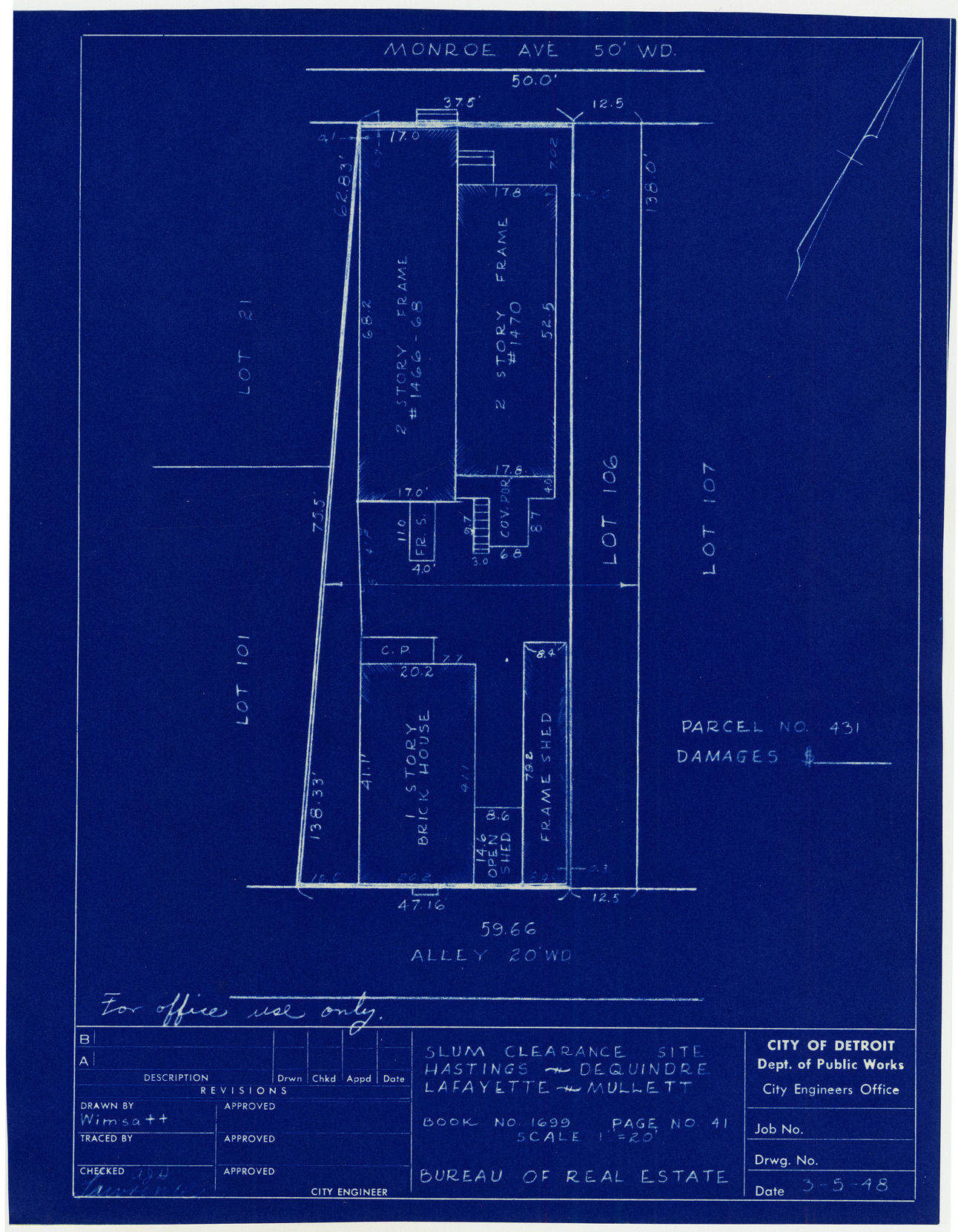 Part of a collection that contains condemnation files, photographs, blueprints and descriptions of slum clearance housing parcels for the City of Detroit. Of particular note are areas which included the neighborhoods known as Paradise Valley, Black Bottom, Corktown and the Jeffries Housing Project.