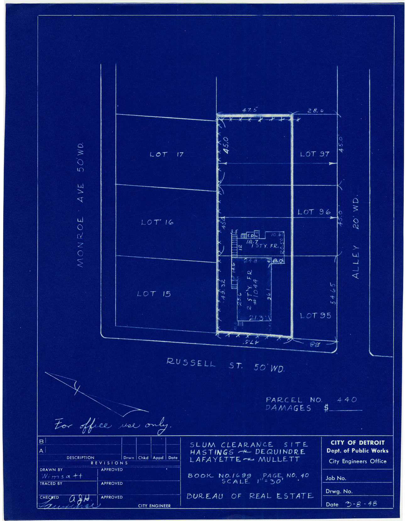 Plot plan for property located on the corner of Russell and Monroe, parcel 440. Recorded on blueprint: "Slum clearance site; Hastings, Dequindre, Lafayette, Mullett."