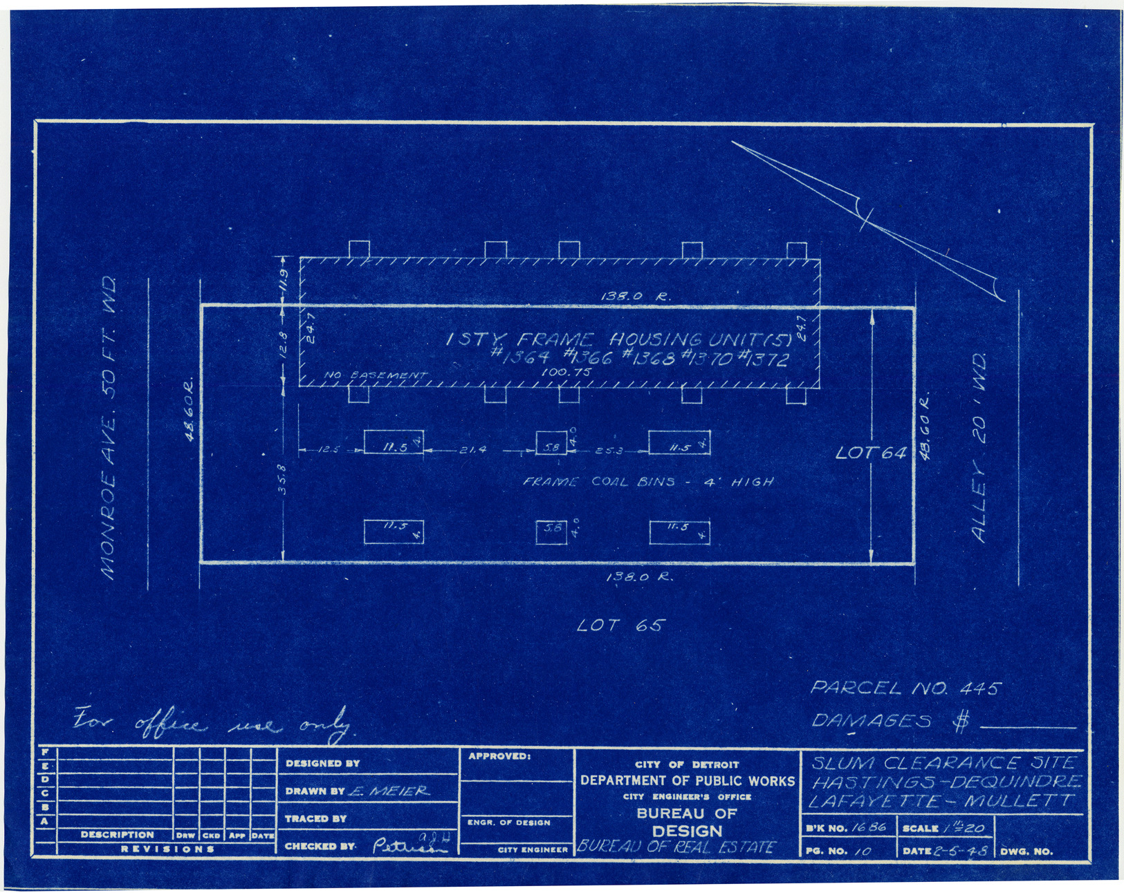 Part of a collection that contains condemnation files, photographs, blueprints and descriptions of slum clearance housing parcels for the City of Detroit. Of particular note are areas which included the neighborhoods known as Paradise Valley, Black Bottom, Corktown and the Jeffries Housing Project.