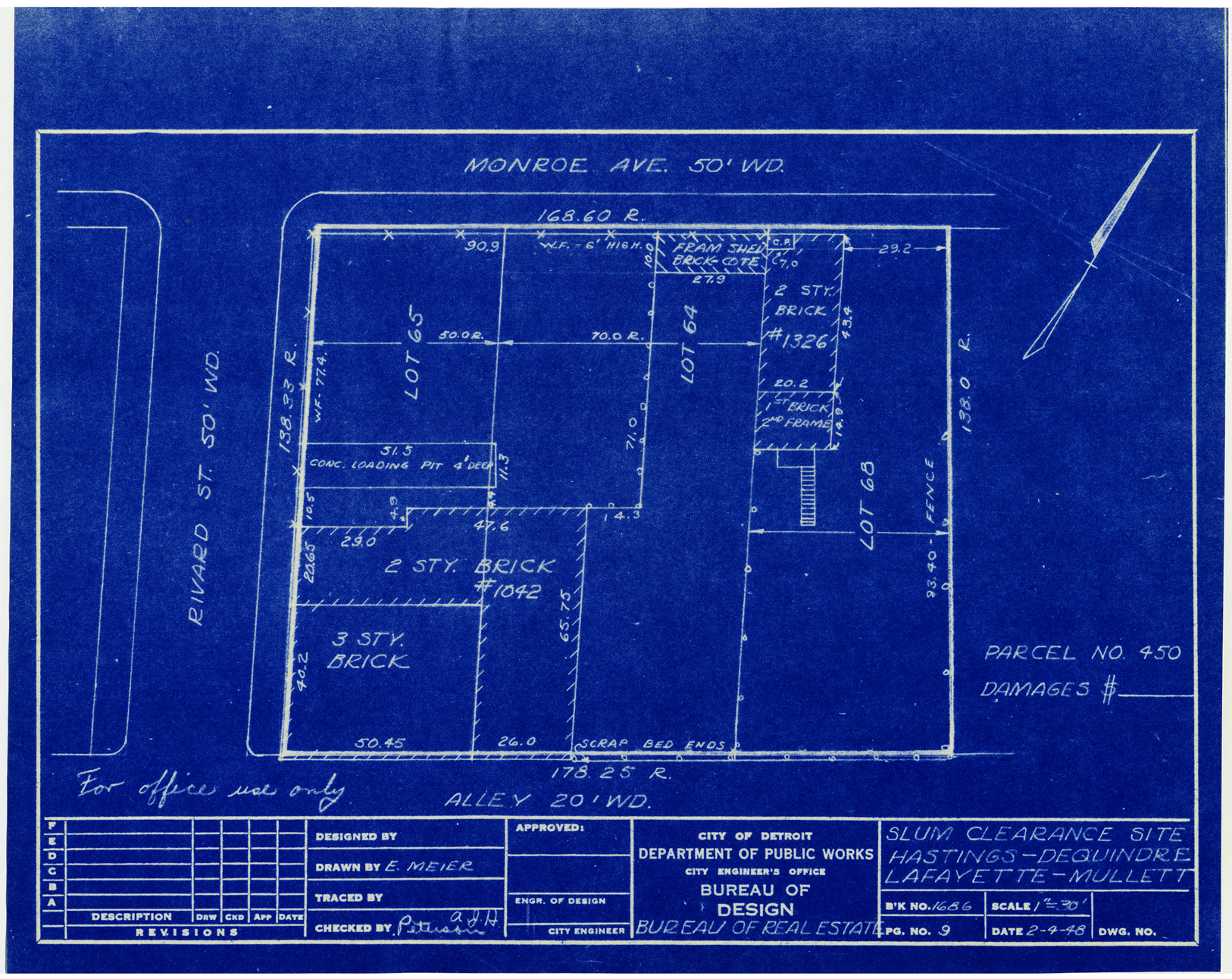 Plot plan for property located on the corner of Monroe and Rivard, parcel 450. Recorded on blueprint: "Slum clearance site; Hastings, Dequindre, Lafayette, Mullett."