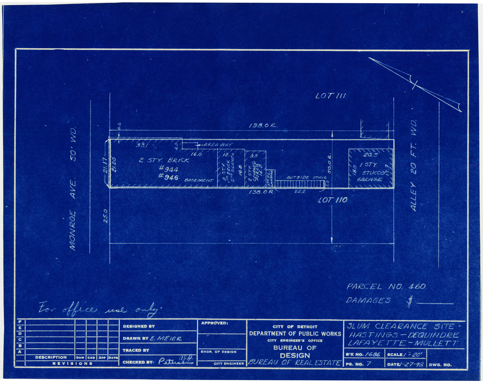 Part of a collection that contains condemnation files, photographs, blueprints and descriptions of slum clearance housing parcels for the City of Detroit. Of particular note are areas which included the neighborhoods known as Paradise Valley, Black Bottom, Corktown and the Jeffries Housing Project.