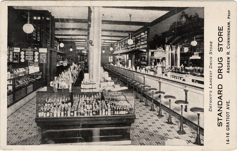 Interior view of Standard Drug Store. Bottles displayed in glass case in foreground; soda fountain counter with stools on right. Shelves line rear walls. Printed on front: "Detroit's largest drug store, Standard Drug Store, 14-16 Gratiot Ave., Andrew R. Cunningham, prop." Card is postmarked 1908.