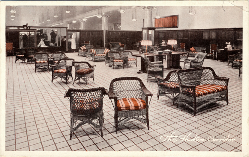 View of enclosed lounge or sitting area in J.L. Hudson's department store. Room is furnished with wicker chairs and sofas; table with lamps in center of room. Clothing department in background. Printed on front: "The Hudson corridor." Printed on back: "Meet me at the [Hudson] corridor. [The J.L.] Hudson Co. grows with Detroit."