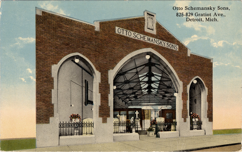 View of Otto Schemansky & Sons. Brick building with vaulted ceiling; gravestones and cemetery monuments displayed inside. Inscribed on building: "Otto Schemansky Sons." Printed on front: "Otto Schemansky Sons, 825-829 Gratiot Ave., Detroit, Mich." Printed on back: "Otto F. Schemansky, Jos. A. Schemansky, Otto Schemansky Sons, established 1883, monuments, 825-829 Gratiot Ave., branch near Mt. Olivet Cemetery, phone Ridge 341, Detroit. Published by Vouwie & Savage, 62 McGraw Bldg., Detroit, Mich. Made in U.S.A. C.T. Co., Chicago, R-57107.""