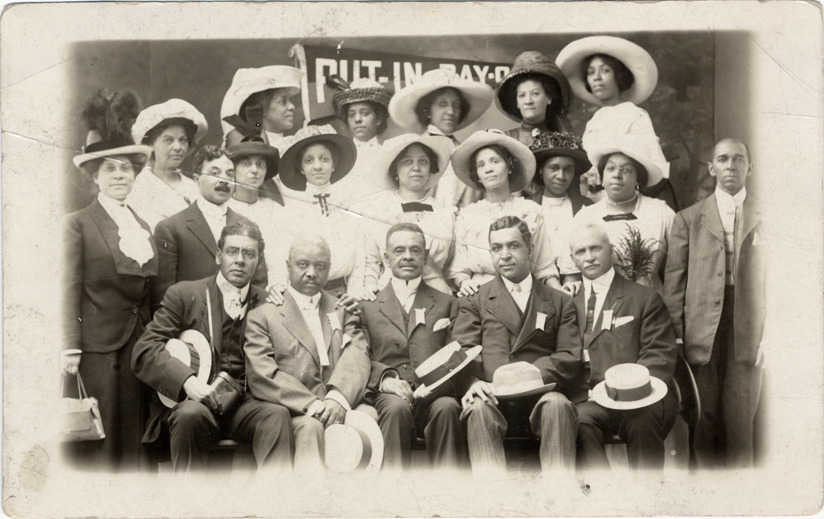View of Social Six Club; men and women pose in front of "Put-in-Bay" pennant. Handwritten on back: "Hexagon Excursion to Put-in-Bay, Aug. 30, 1912. Members: Mr. Wm. Heiskell, Mr. Chas. Brown, Mr. John Anderson, Mr. Roscoe Douglass, Mr. Robt Duncan, Mrs. Virginia Harris, Mrs. Roscoe Douglass, Mrs. Mary White, Mrs. John Anderson, Mrs. Wm. Heiskell, Mrs. Lulu Griffin, Mrs. Thomlinson, Mrs. Smith -- Cincin, O. , Miss Clara Thomlinson, Miss Maud Vosburgh, Mrs. Ethel Rideout, Mrs. Lulu Owens, Mrs. Reynolds -- Toledo, O., Mr. French -- Sandusky, O., Mr. Coleman -- Wheeling, W. Va."