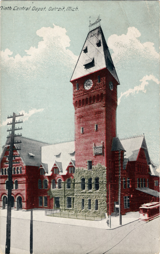 Front and side view of Michigan Central Railroad Station designed by Cyrus L.W. Eidlitz. Ivy-covered brick building has square clock tower and arched windows; streetcar adjacent to building. Sign on tower: "Michigan Central R.R. Station." Printed on front: "Ninth Central Depot, Detroit, Mich."
