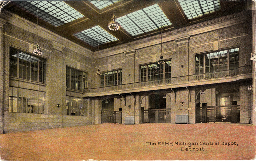 Favorite this☆ Interior of Michigan Central Railroad Station Description: Interior view of Michigan Central Railroad Station. Room has decorative brickwork; paned windows; wrought-iron balcony and skylight in ceiling. Printed on front: "The ramp, Michigan Central Depot, Detroit." Details Resource ID: bh002780 Subject: Railroad stations--Michigan--Detroit Michigan Central Railroad Company Warren & Wetmore Reed & Stem Postcards Date Issued: Unknown year Format: 1 postcard : col. ; 3.5 x 5.5 in. Member of: Burton Historical Collection Filing Location: D/Railroads-Michigan Central Depot-Interior Rights: Physical rights are retained by DPL. Copyright is retained in accordance with U.S. copyright laws.