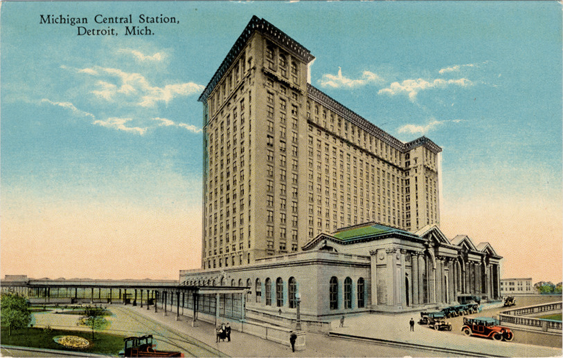 Front and side view of Michigan Central Railroad station and grounds; automobiles parked in front of station. Printed on front: "Michigan Central Station, Detroit, Mich." Printed on back: " Michigan Central Station, Detroit, Mich. The new Michigan Central Station is located near Michigan Avenue between Fifteenth and Seventeenth Streets, covers twenty-one acres and the total cost is $15,000,000.00. There are eleven tracks in the station that accommodate 135 passenger coaches. It has all conveniences, such as a complete drug store with special facilities for the care of invalids and change room where travellers can at nominal cost obtain shower baths and and make a change of clothing. Accommodations for passengers are not outdone by any railroad station in the world. C.T. Co., Chicago, R-7909[?]." Handwritten on back: "Dear Maura, Everything O.K. Hope you got my letter today. Mrs. Crossman's address is 209 2nd St. Don't tell Aunt Abbie but Vesta was over there today she & Hazel are cleaning house. With love, B. ... visit at every cross ... you want to."