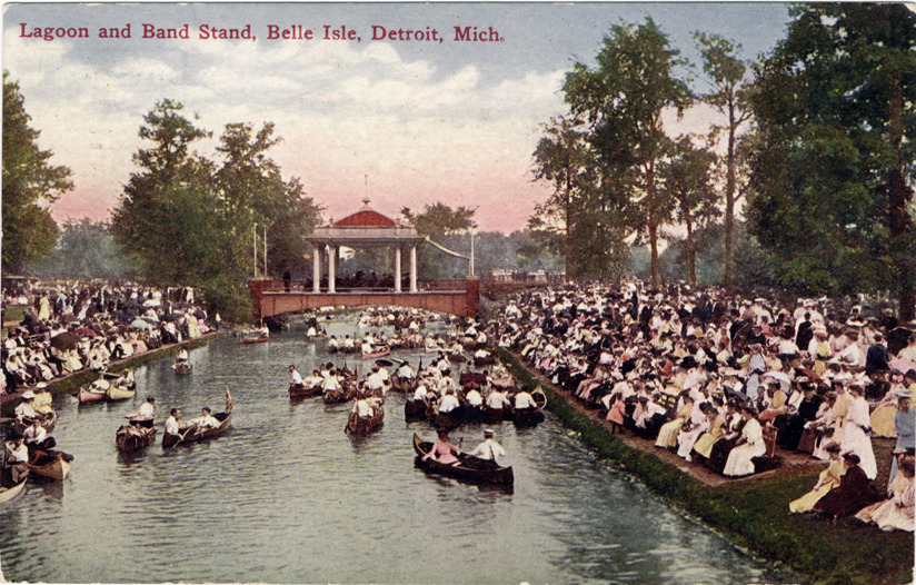 Favorite this☆ Bandstand on Belle Isle Description: View of open-air pavilion on bridge over canal on Belle Isle. Numerous boaters travel on canal; crowd gathers on banks for concert. Printed on front: "Lagoon and band stand, Belle Isle, Detroit, Mich." Details Resource ID: bh002809 Subject: Belle Isle Park (Detroit, Mich.) Bandstands--Michigan--Detroit Canals--Michigan--Detroit Boats and boating--Michigan--Detroit Postcards Date Issued: Unknown year Format: 1 postcard : col. ; 3.5 x 5.5 in. Member of: Burton Historical Collection Filing Location: D/Parks-Belle Isle-Canals Rights: Physical rights are retained by DPL. Copyright is retained in accordance with U.S. copyright laws.
