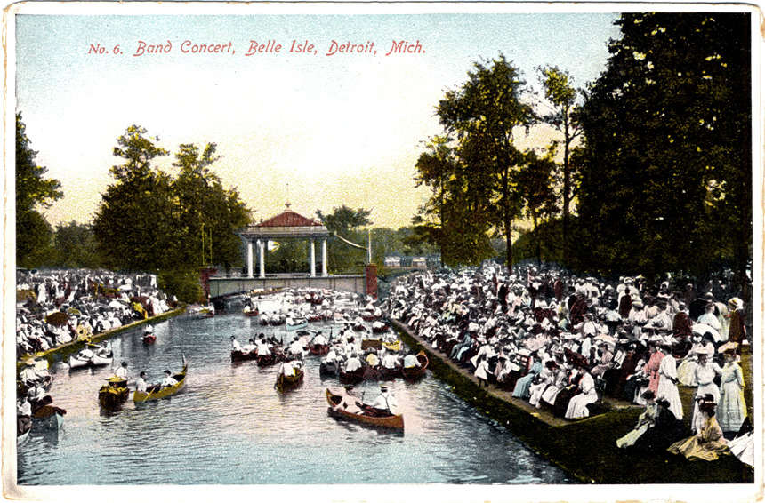 View of open-air pavilion on bridge over canal on Belle Isle. Numerous boaters travel on canal; crowd gathers on banks for concert. Printed on front: "No. 6, Band concert, Belle Isle, Detroit, Mich." Printed on back: "Published by Wolverine News Co., Detroit, Mich. and Leipzig. Made in Germany."