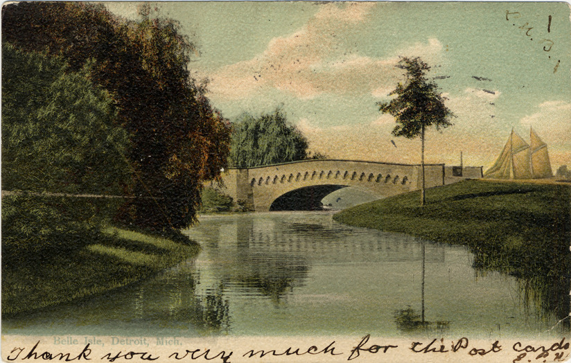 View of arched stone bridge over canal on Belle Isle; sailboat in background. Printed on front: "Belle Isle, Detroit, Mich." Handwritten on front: "Thank you very much for the post card, E.P.H." Printed on back: "314, H.L. Woehler, Buffalo, N.Y & Dresden, Germany." Card is postmarked September 6, 1906.