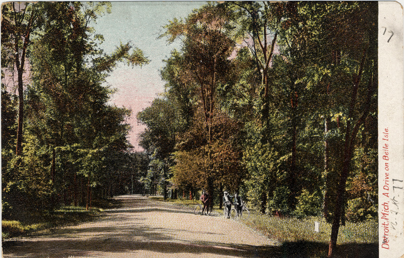 View of three men with bicycles on a road in a wooded area on Belle Isle. Printed on front: "Detroit, Mich. A drive on Belle Isle." Printed on back: "The Hugh C. Leighton Co., manufacturers, Portland, Me., U.S.A. Printed in Frankfort o/Main Germany, no. 2615." Handwritten on back: "N.J.W. 1/25/07."