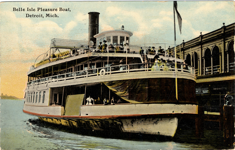 View of men and women on the decks of the steamer Promise; boat is docked at the foot of Woodward Ave. Printed on front: "Belle Isle pleasure boat, Detroit, Mich." Printed on back: "Belle Isle pleasure boat, Detroit, Mich. This picture shows the steamer Promise, one of the fleet of the Belle Isle and Windsor Ferry Co. These boats leave Third Street and foot of Woodward Avenue every 15 minutes for Belle Isle. Detroit has the finest fleet of excursion steamers in the world. Published by Wolverine News Co., Detroit, Mich. Made in U.S.A." Handwritten on back: "Helo [sic] Charles, how are you & all the rest of folks give my best wishes to all & of course keep some for your self. E.L. Fredenburg." Card is postmarked September 3, 1911.