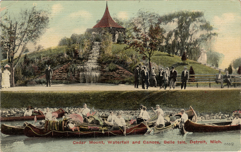 View of pavilion on top of small hill on Belle Isle; waterfall cascades down side of hill. Men and women stand on roadway on the banks of canal; group of canoeists, some holding American flags, travel on canal in foreground. Printed on front: "Cedar mount [sic], waterfall and canoes, Belle Isle, Detroit, Mich." Printed on back: "1330, Cedar mount [sic], waterfall and canoes, Belle Isle. Belle Isle is in the Detroit river, between Detroit and Windsor, Canada. The Island contains 702 acres and is entirely covered with one of the most beautiful parks in the United States, having some 21 miles of macadam roads, a magnificent casino, pavilions, boat houses, aquarium, horticultural hall and zoological gardens. The island was purchased by Detroit in 1879. Since then $1,600,000 has been expended in beautifying it." Souvenir Post Card Co. publisher trademark printed on back of card. Handwritten on back: "Sept. 4, 1913. Dear sister, how are you I am having a good time I picked up totatoes [sic] at Clara and got cheated out of a auto ride. Sister Lillian." Card is postmarked September 4, 1913.
