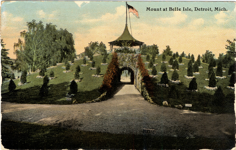 View of pavilion with American flag on top of small hill or mound on Belle Isle. Hill is landscaped with small cedar trees; arched tunnel is cut through center of hill. Gravel footpath in foreground. Printed on front: "Mount at Belle Isle, Detroit, Mich." Printed on back: "Mount at Belle Isle, Detroit, Mich. This mount is near the casino on Belle Isle. A cascade flows down its sides and an archway runs through the center. Steps lead to the rest house on the top of the mount. Published by Wolverine News Co., Detroit, Mich. Made in U.S.A." Handwritten on back: "I expect to be in the city until the 7 of Oct. come the last of the month & stay any Sunday for Aunt Sate will be at the fair during the week & I have a date for the next two Sundays. Will." Card is postmarked September 15, 1911.