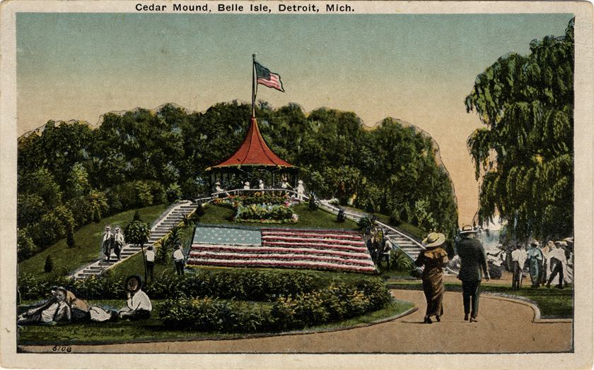 View of Cedar mound on Belle Isle; small landscaped hill has steps leading to pavilion at top. Large American flag created out of flowers on side of hill; men and women sit under pavilion and walk on footpaths. Printed on front: "Cedar mound, Belle Isle, Detroit, Mich., 6108." Printed on back: "Belle Isle is in the Detroit river, between Detroit and Windsor, Canada. The Island contains 702 acres and is entirely covered with one of the most beautiful parks in the United States, having some 21 miles of macadam roads, a magnificent casino, pavilions, boat houses, aquarium, horticultural hall and zoological gardens. The island was purchased by Detroit in 1879. Since then $1,600,000 has been expended in beautifying it."