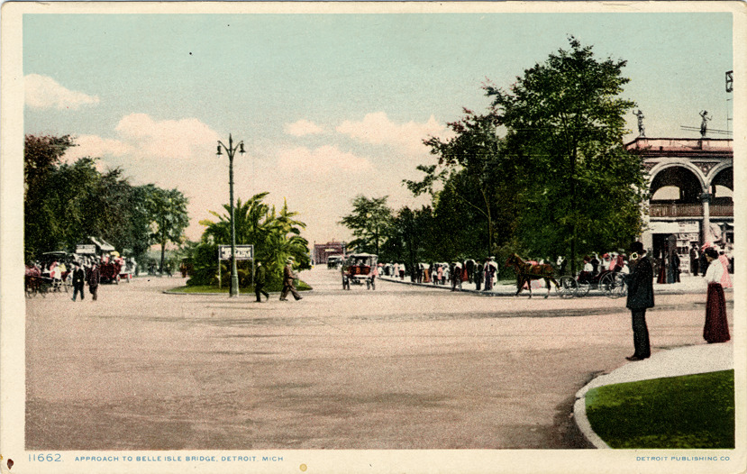 View of tree-lined boulevard leading to Belle Isle bridge. Pedestrians walk on sidewalks; horse-drawn wagons and carriages in street. Printed on front: "11662, Approach to Belle Isle bridge, Detroit, Mich., Detroit Publishing Co." Printed on back: "Phostint card made only by Detroit Publishing Co."