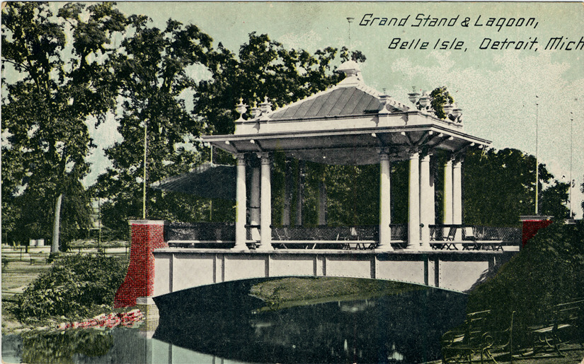Favorite this☆ Bandstand on Belle Isle Description: View of open-air pavilion with Corinthian columns, possibly used as a bandstand, on a bridge over canal on Belle Isle. Printed on front: "Grand stand & lagoon, Belle Isle, Detroit, Mich." Handwritten on back in upper right corner: "9/9/12." Details Resource ID: bh002878 Subject: Belle Isle Park (Detroit, Mich.) Pavilions--Michigan--Detroit Bandstands--Michigan--Detroit Bridges--Michigan--Detroit Postcards Date Issued: Unknown year Format: 1 postcard : col. ; 3.5 x 5.5 in. Member of: Burton Historical Collection Filing Location: D/Parks-Belle Isle Rights: Physical rights are retained by DPL. Copyright is retained in accordance with U.S. copyright laws.