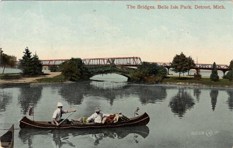 View of two men paddling a canoe on Belle Isle canal near arched stone bridge. Belle Isle truss bridge in background. Printed on front: "The Bridges, Belle Isle Park, Detroit, Mich." Printed on back: "Published by S.H. Knox & Co., Detroit, Mich. Printed in Great Britain." Handwritten on back: "3/26/09. This has been another fine day. I received your letter this p.m. I walked down town tonight with J. Miller and we are going to the Temple tonight. We are going to have baseball practice out in the field tomorrow. E.A.S." Card is postmarked March 26, 1909.